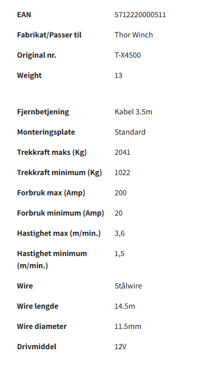 Trekkvinsj 2041Kg Kr 3.445,00 Velg antall Trekkvinsj 2041Kg 12V Thor Winch T-X4500 med wire: Ø6,4mm x 14,5m Del denne siden med andre! Ditt navn: Din epost: Mottakers navn: Mottakers epost: Klarte ikke å laste inn Facebook-feeden.Klikk her for å gå til Facebook-siden vår!